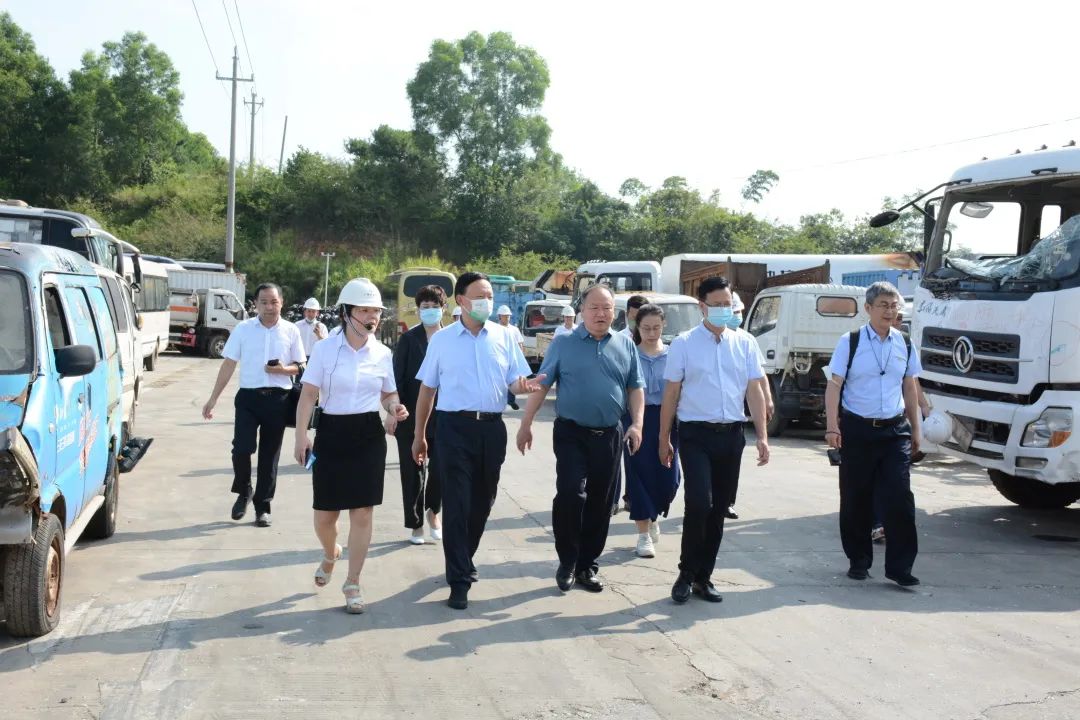 在報(bào)廢機(jī)動(dòng)車拆解中心,李碧丹詳細(xì)向郭承站介紹了廠區(qū)布局、“回收-注銷-拆解”作業(yè)流程、治污減排工作以及危險(xiǎn)廢物管理等情況。